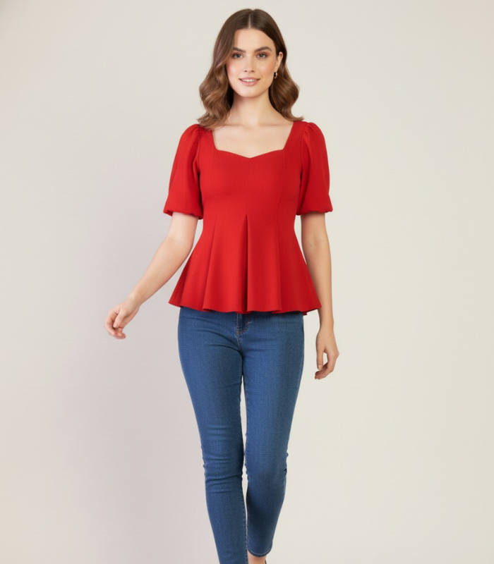 Turn heads in the Stretchable Puff Sleeves Peplum Top, designed to flatter with every detail. Featuring a sweetheart neckline and soft puff sleeves, this top brings a perfect balance of romance and structure. The fitted bodice flows into a subtle peplum hem, enhancing the waist while offering an effortlessly elegant silhouette. Crafted from a textured, breathable fabric, it feels as good as it looks.